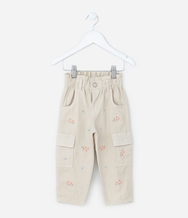 Calça Infantil com Bolsos Cargo e Bordado Florzinhas - Tam 1 a 6 Anos