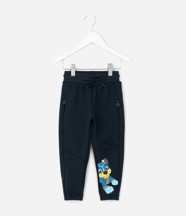 Calça infantil com cintura elástica, cordinha para ajuste, barra elástica, bolsos aplicados com zíper e puxador de patinhas e estampas da Patrulha Canina.
