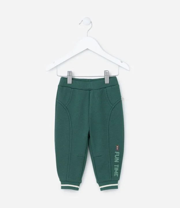 Calça Infantil com Recortes e Lettering Fun Time - Tam 0 a 18 meses Verde
