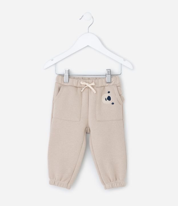 Calça Infantil com Urso Aplicado no Bolso – Tam 0 a 18 Meses Bege Claro
