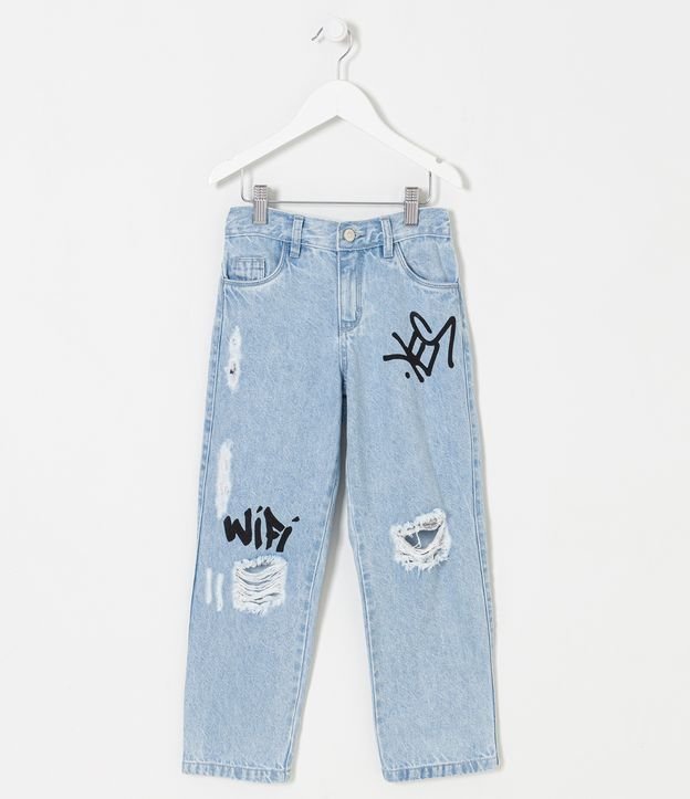 Calça Reta Infantil em Jeans com Puídos e Lettering Grafitados - Tam 5 a 14 anos