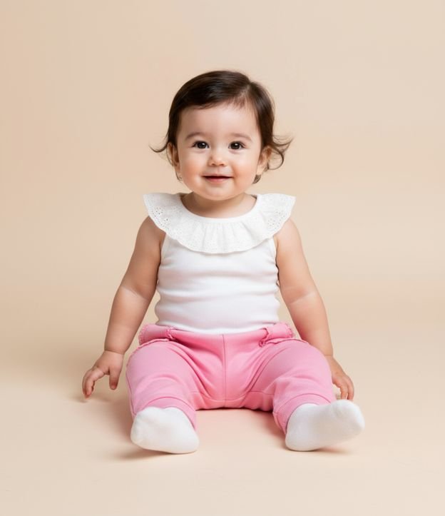 Calça de moletom infantil para bebês, com forro quentinho e cós elástico. Sem estampa, possui punhos ajustados e detalhe de bolsinho lateral com rendinha crochetada.
