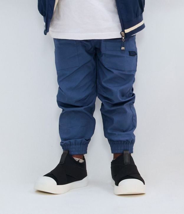 Calça infantil em sarja leve confeccionada em algodão mais sustentável. A peça tem textura, cós elástico, cordão para ajuste, bolsos laterais e recortes.