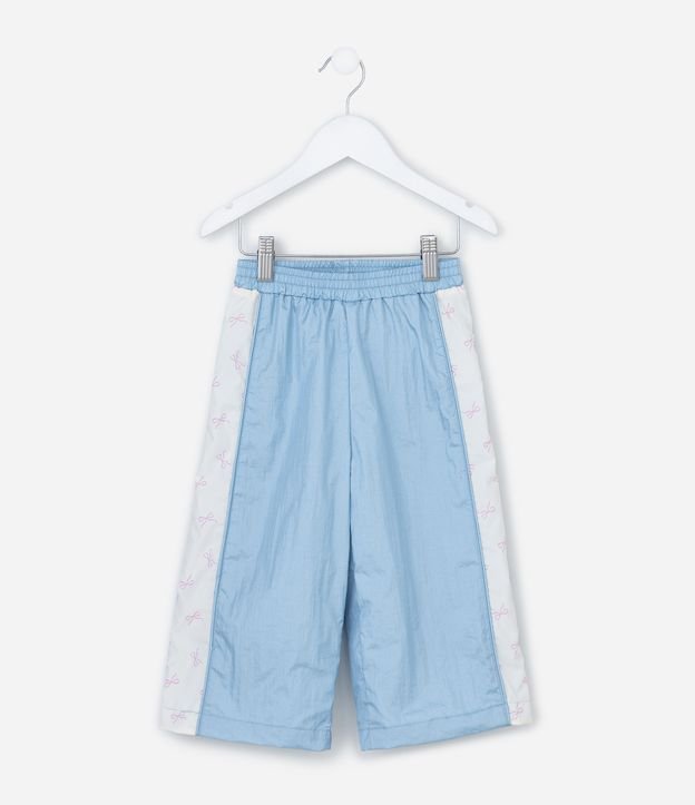 Calça infantil confeccionada em microfibra. Possui modelo wide leg, cós elástico, recorte lateral que possui estampa de lacinhos.