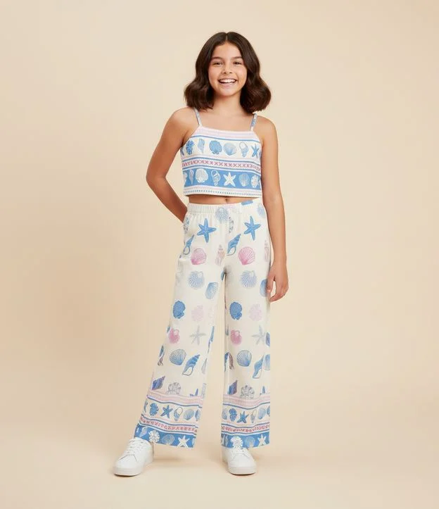 Calça Infantil Wide LEg em Viscolinho com Estampa de Conchas - Tam 5 a 14 Anos