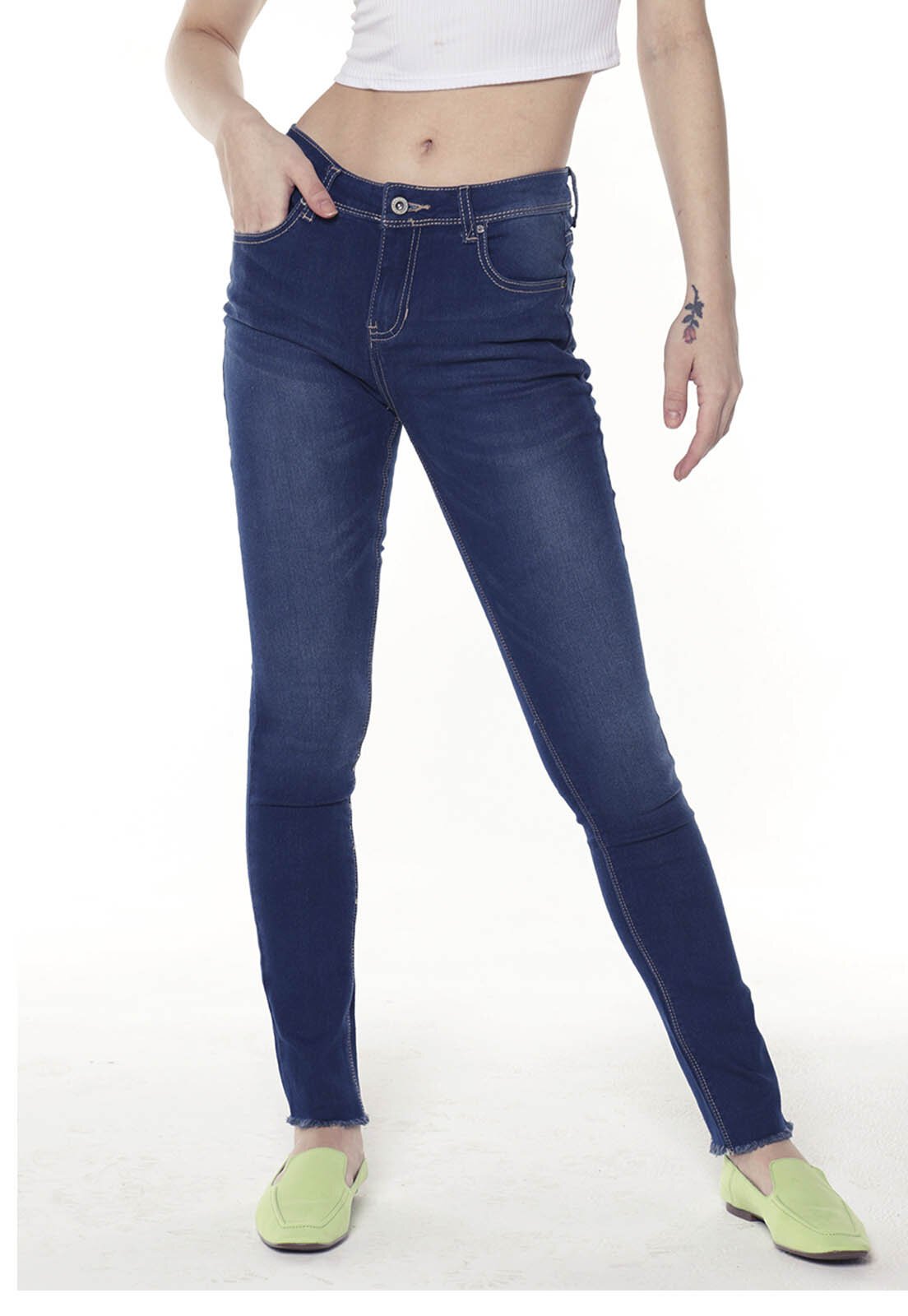 Calça Jeans Cintura Baixa Skinny Sob Azul Escura Barra Desfiada