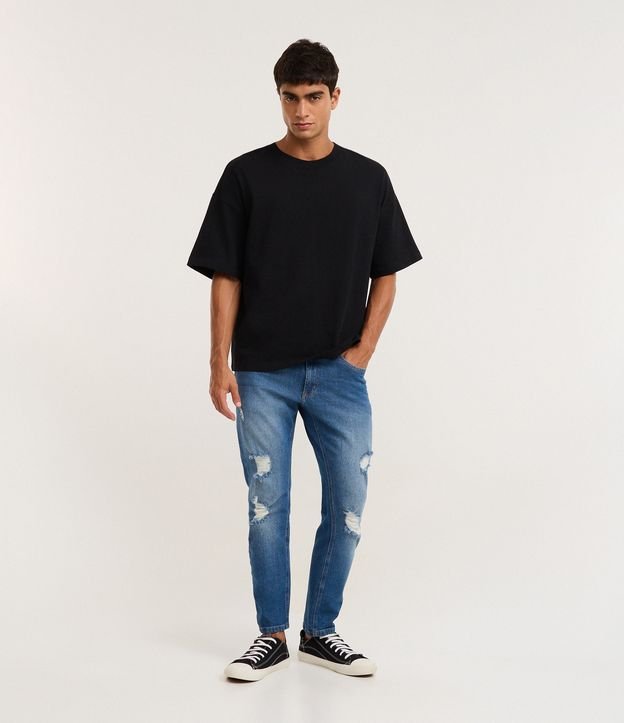 Calça masculina confeccionada em algodão certificado BCI e boas práticas ambientais. Modelo skinny cropped com rasgos, cintura média e tecido jeans confortável, ideal para compor looks casuais com estilo.
