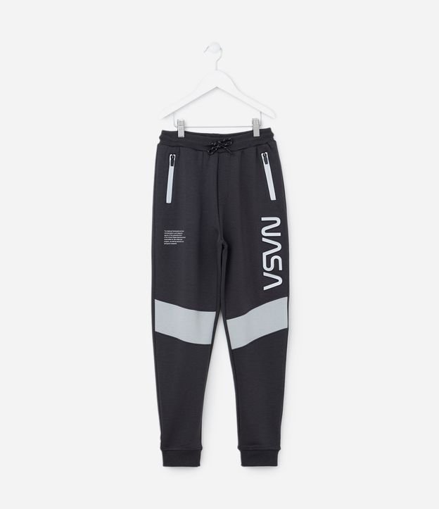 Calça jogger infantil, com amarração no cós, bolsos com fechamento por zíper, recortes contrastantes nos joelhos e diferencial de estampa refletiva da NASA.