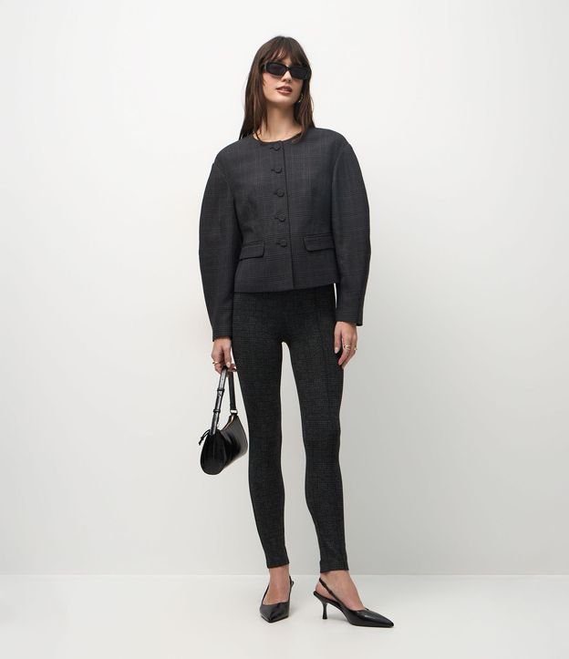 Calça legging feminina em malha ponto roma, com estampa marcada, nervura frontal e cós alto com elástico.
