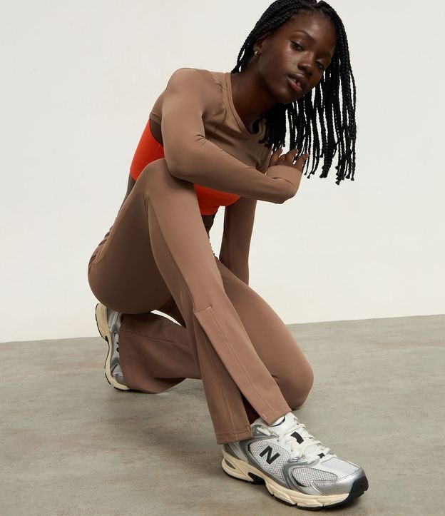Calça Legging Flare Esportiva em Microfibra com Fenda Marrom