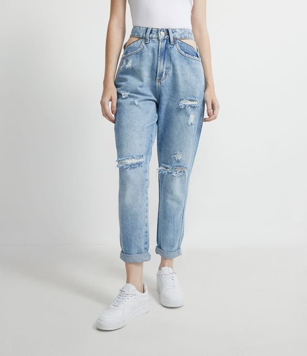 Calça Mom Jeans com Puídos e Recorte Vazado nos Bolsos