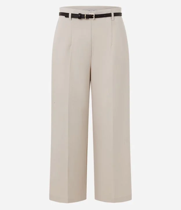 Calça Pantacourt Alfaiatada em Crepe com Cinto Bege
