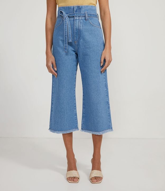 Calça Pantacourt Jeans com Barra Desfiada e Cinto Faixa