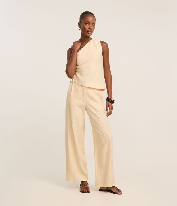 Calça Pantalona Alfaiatada com Frisos Frontais e Bolsos Bege