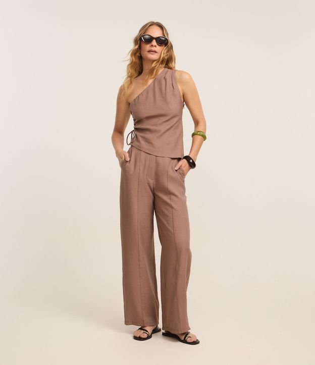 Calça Pantalona Alfaiatada com Frisos Frontais e Bolsos Marrom Médio