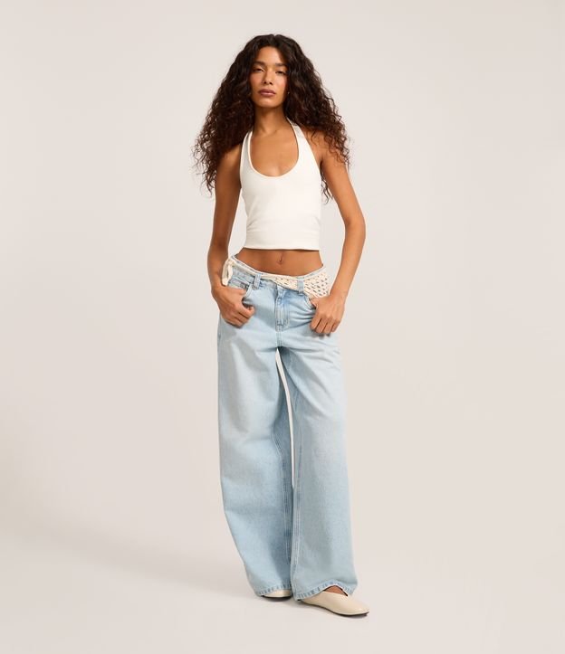 Calça Pantalona Cintura Média em Jeans com Cinto de Tricô Claro