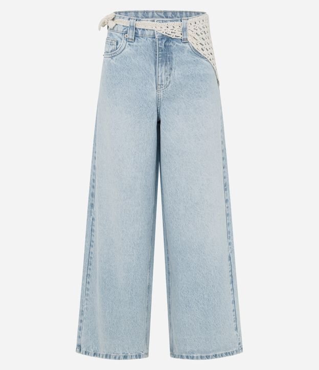 Calça pantalona de cintura média, confeccionada em jeans, com passantes no cós, fechamento tradicional e bolsos. Inclui cinto com efeito crochê. Este produto possui material mais sustentável em sua composição, sendo ambientalmente mais responsável.