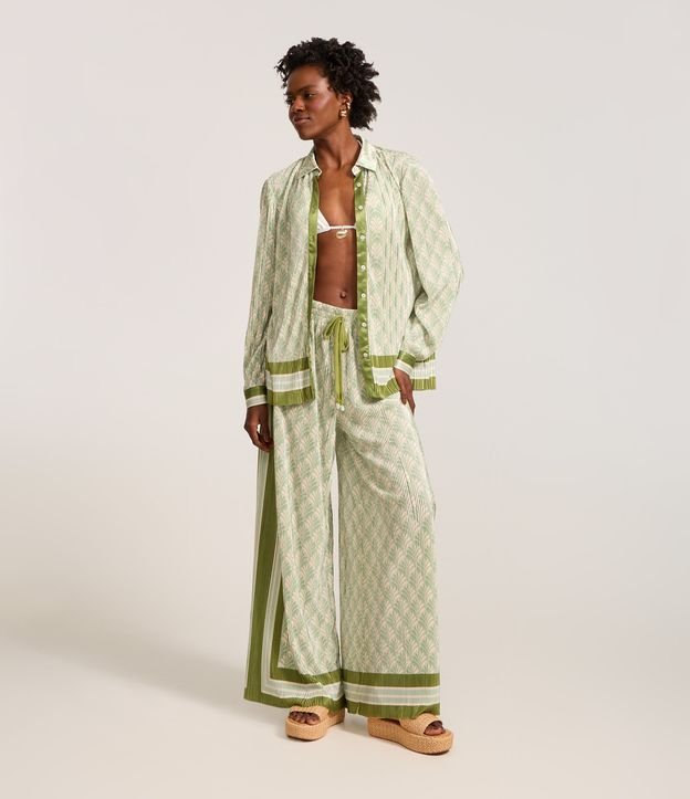 Calça Pantalona com Cordão no Cós e Listras Laterais Bege/Verde