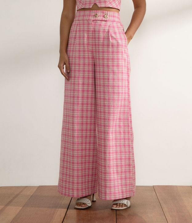 Calça Pantalona em Algodão com Cintura Alta e Padronagem Xadrez