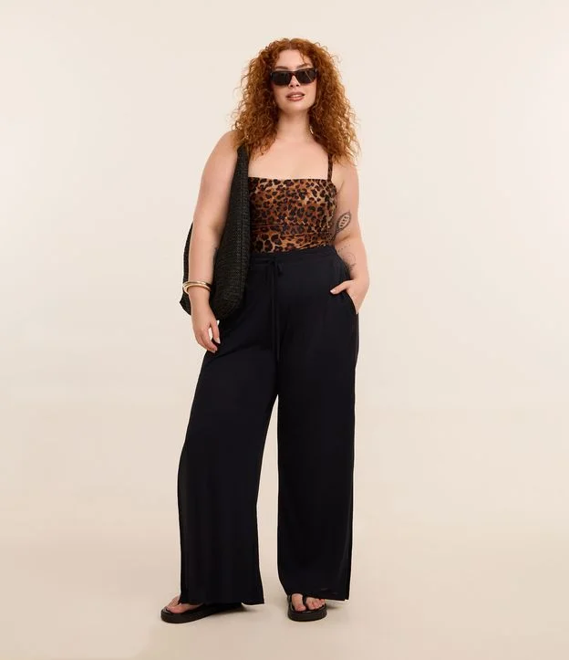 Calça plus size esportiva confeccionada em microfibra texturizada e sem estampa. A peça modelo pantalona tem fenda na barra e bermuda ciclista interna.