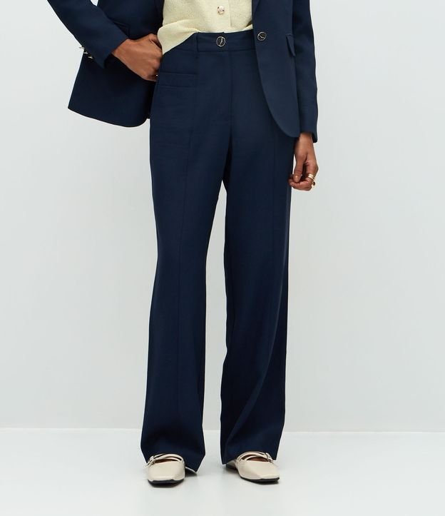 Calça Reta Alfaiatada Cintura Alta com Botão Diferenciado Azul Marinho