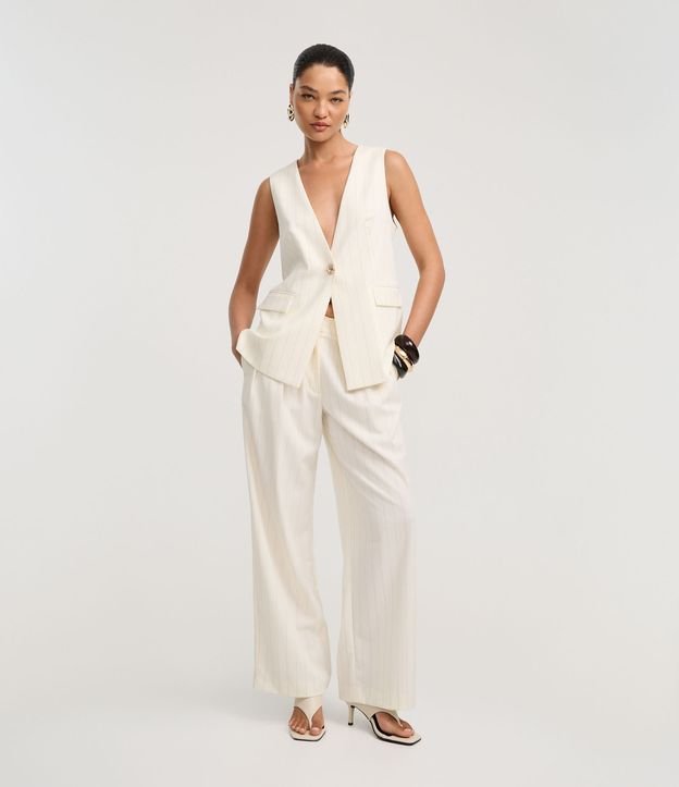 Calça Reta Alfaiatada Cintura Alta em Viscose com Listras Off White