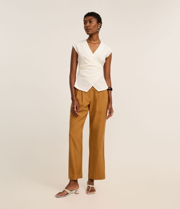 Calça Reta Alfaiatada com Cós Transpassado e Pregas Caramelo