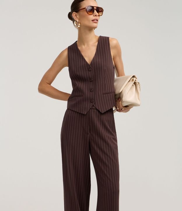 Calça Reta Alfaiatada em Crepe com Listras de Fio Tinto Marrom