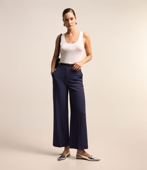 Calça Reta Alfaiatada em Viscose com Listras Riscas de Giz Azul