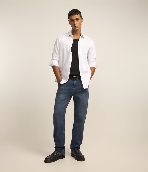 Calça Reta Básica Jeans Denim e Pesponto Contrastante Azul Médio
