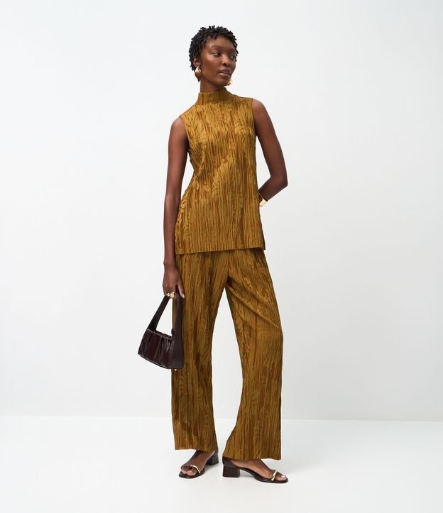 Calça Reta Cintura Alta com Textura Jacquard Amarelo Queimado