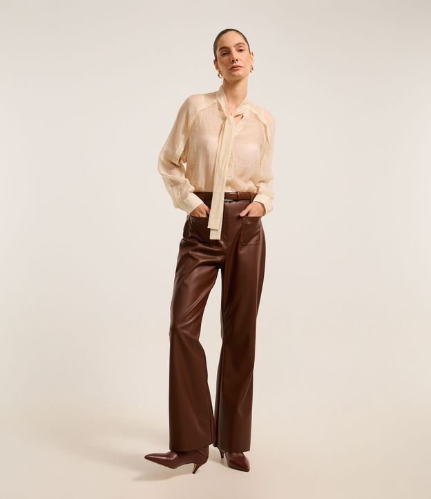 Calça Reta Cintura Alta em PU com Cós Alfaiatado Marrom