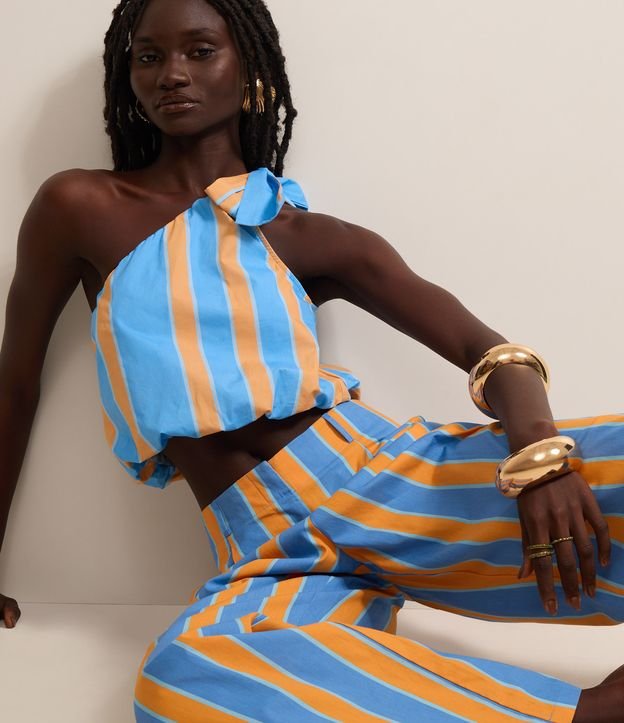Calça Reta Cintura Alta em Tricoline com Listras Verticais Azul/Laranja