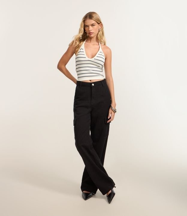 Calça Reta Comfort em Sarja com Bolsos Cargo Preto