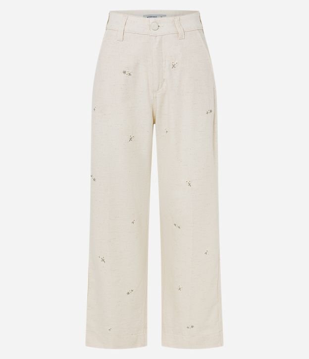 Calça Reta Cropped em Algodão com Bordado Floral Bege