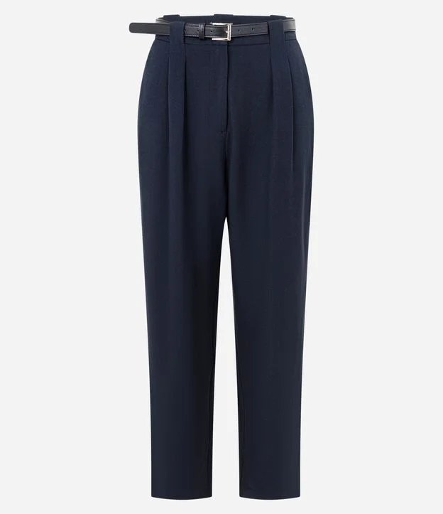 Calça Reta em Crepe com Cinto no Cós e Pregas Azul
