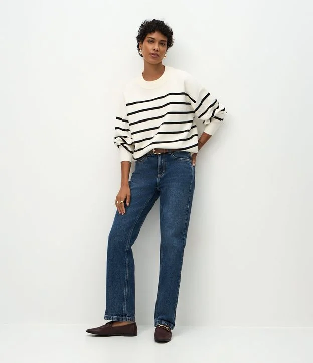 Calça feminina reta em jeans encorpado com leve elasticidade para conforto no uso diário. Possui cintura média, bolsos funcionais, passantes e fechamento frontal por zíper e botão. Confeccionado em algodão certificado BCI e boas práticas ambientais, entregando visual versátil para compor looks casuais e clássicos.