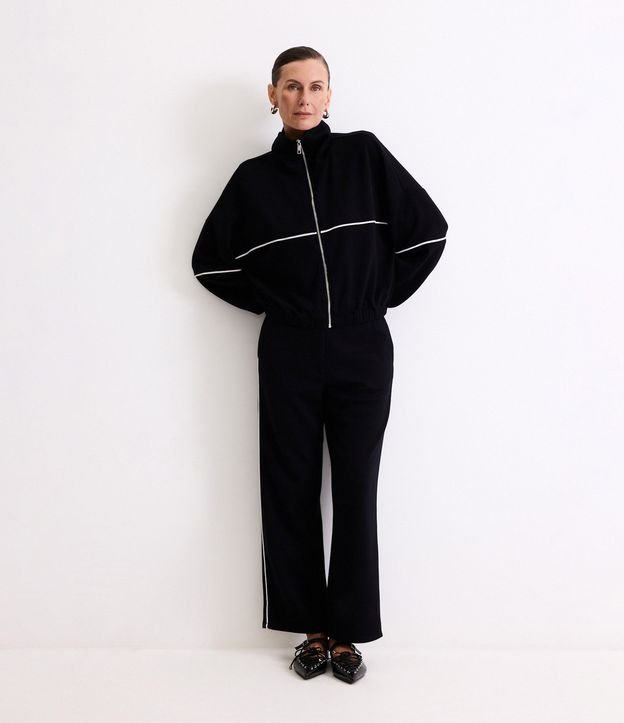 Calça Reta em Moletom com Modal e Viés Contrastante Preto