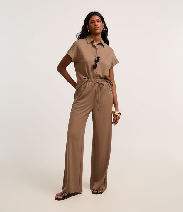 Calça Reta em Orly com Elástico e Amarração no Cós Marrom