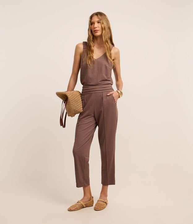 Calça Reta em Piquet com Cós Pespontado e Frisos Marrom