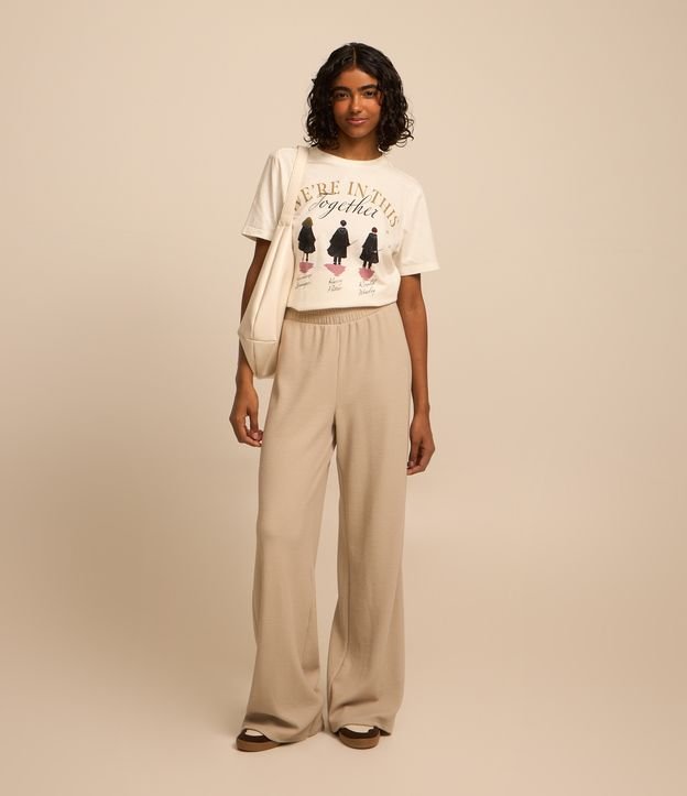 Calça reta em ribana com cós largo em elástico, texturizada confeccionada em boas práticas ambientais e sem estampa.