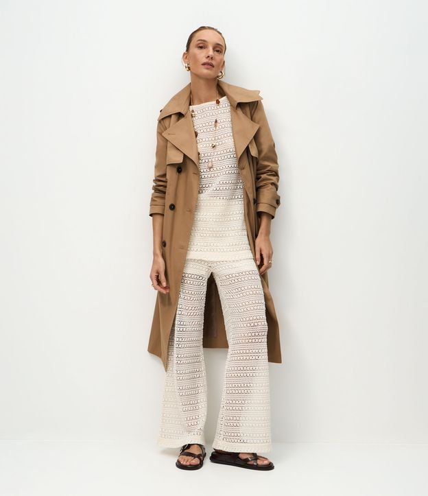 Calça Reta em Tela Crochetada com Cós Estruturado Off White