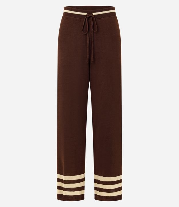 Calça Reta em Tricô com Detalhes de Listras Marrom