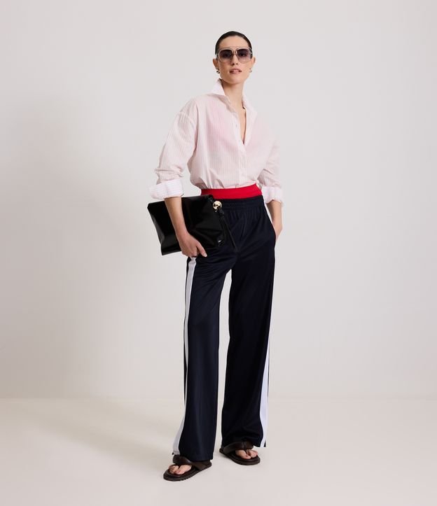 Calça Reta Esportiva em Helanca com Listras e Fenda Lateral Azul