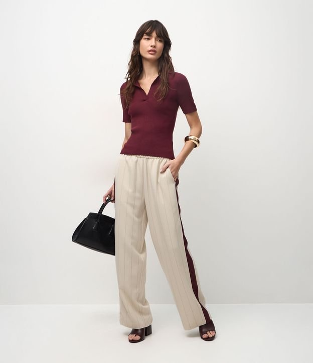 Calça feminina com risca de giz com modelagem reta. Possui cós elástico, estampa listrada, laterais com faixa contrastante que destaca o visual.