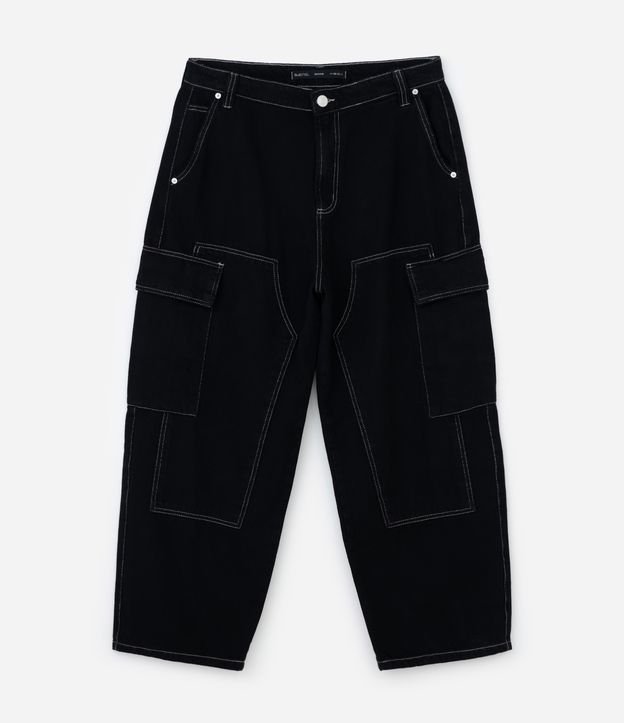 Calça Skater em Jeans com Bolso Cargo e Recortes Preto