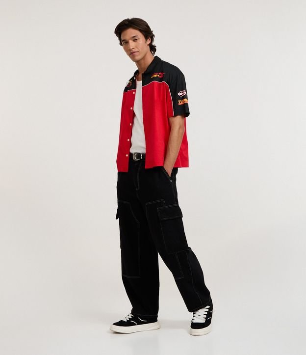 Calça Skater em Jeans com Bolso Cargo e Recortes Preto