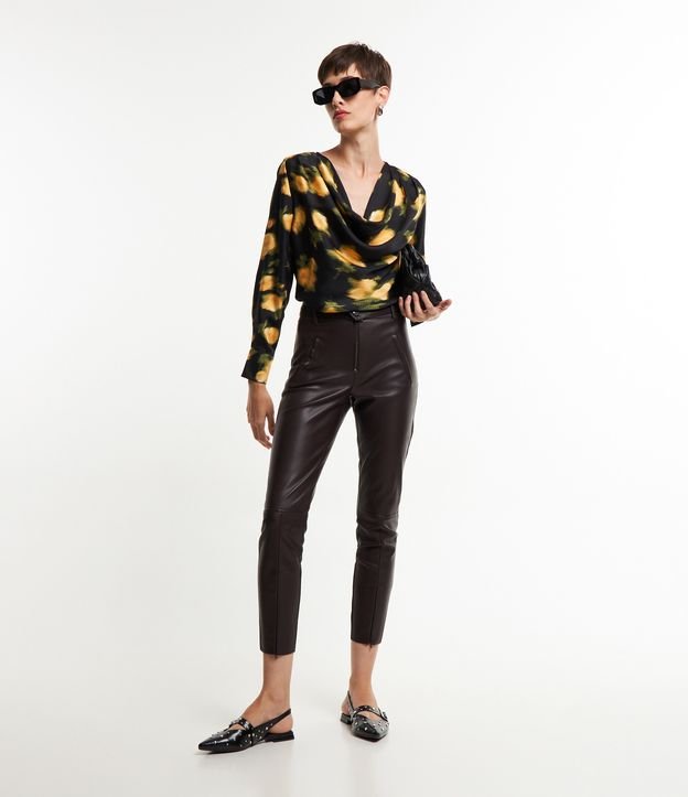 Calça Skinny em Material Sintético com Botão no Cós e Recortes Marrom