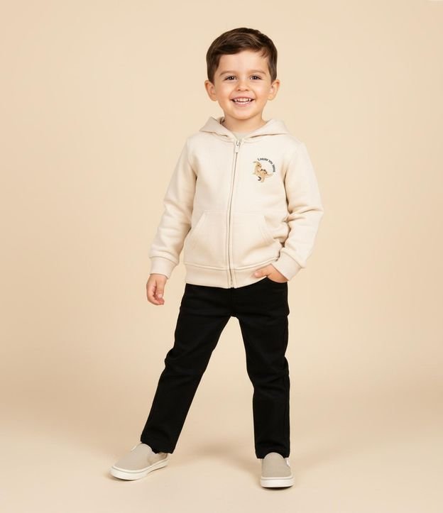 Calça infantil confeccionada em sarja, de modelo skinny, com passantes no cós e bolsos faca. Sem estampa, possui fechamento frontal com botão e zíper.
