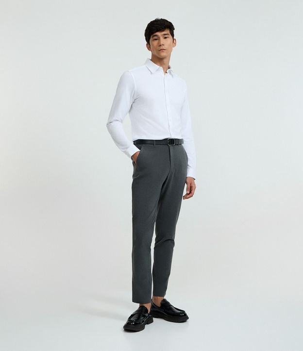 Calça slim masculina com detalhe no cós elástico com passantes, unindo elegância e praticidade. Fechamento tradicional, bolsos funcionais e tecido sofisticado para compor looks casuais ou formais.